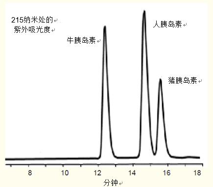 條件 色譜柱:ACE 5 C18,4.6 x 250mm 洗脫液:含有29.3 - 31.7% 乙腈的 0.1% 三氟乙酸溶液,以1.0毫升/分鐘的速率洗脫至少16分鐘 樣品:牛、人和豬胰島素 |