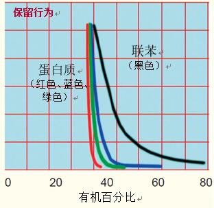小分子的保留行為隨著有機溶劑濃度的改變而緩慢改變時(圖5,聯(lián)苯),一旦有機溶劑的濃度達到所需要的值,蛋白質(zhì)的保留行為即發(fā)生突然改變,引起保留時間的快速變化(圖5,蛋白質(zhì))。